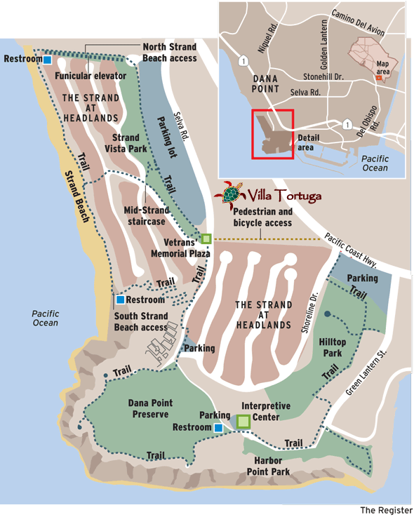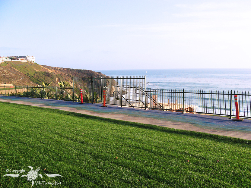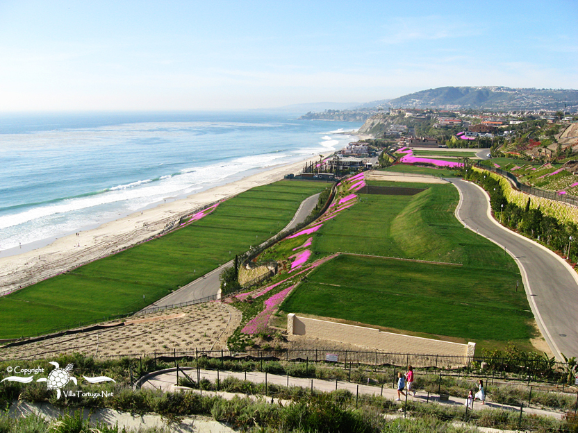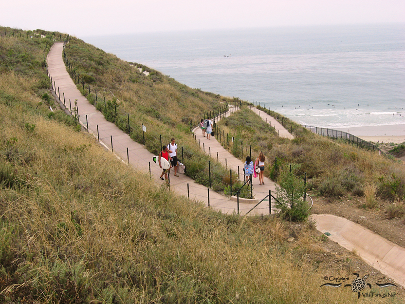This switchback beach access route provides the most spectacular views of the headlands and Strands Beach below. The trail-head entrance is just to the South of the complex and the path has the most gentle slope. There are stairs at the bottom, but fewer than with the other routes. There are showers and restrooms at the beach level.